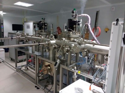Evaporation system is formed for two independent UHV chambers with a base pressure of 10-10 mbar. One of them is equipped with an e-beam evaporation source, which allows the deposition of metals and metal in substrates up to 51 cm diameter. The second chamber is for molecular materials...