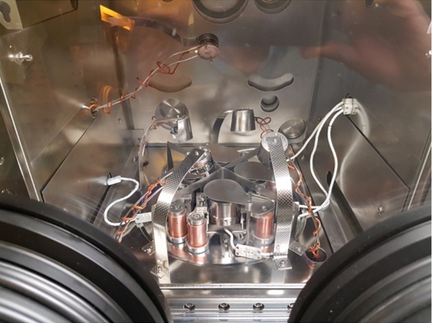 This vacuum chamber allows us to sublime materials in high vacuum (10-6 mbar), which are deposited homogeneously as films into...